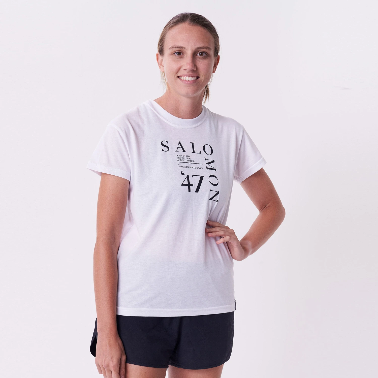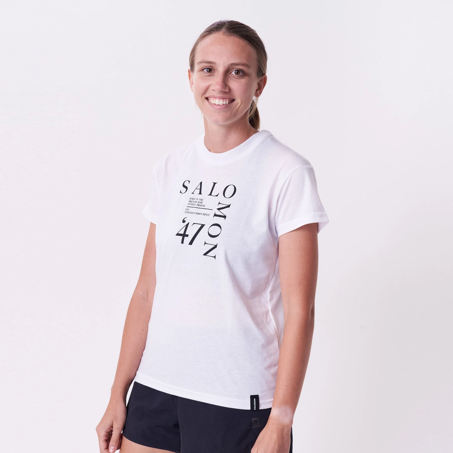 Short sleeve women’s tee shirt with Salomon graphic.
